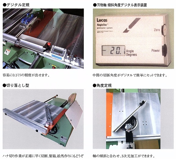 他、デジタル定規、刃物軸傾斜角度デジタル表示装置、切り落とし型、角度定規。